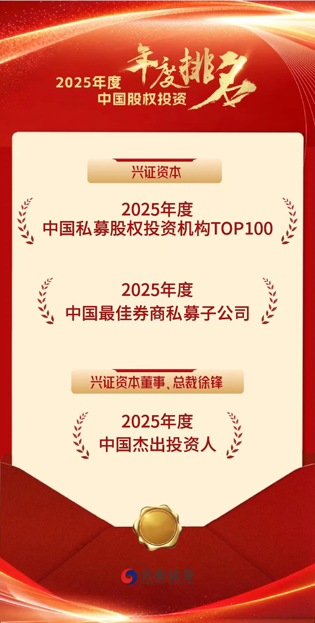 1月14日,融中2025年度中国股权投资榜重磅发布,兴证资本凭借出色的基金管理能力和投资业绩荣获融中“2025年度中国私募股权投资机构TOP100”和融中“2025年度中国最佳券商私募子公司”,同时,兴证资本董事、总裁徐锋入选融中“2025年度中国杰出投资人”。